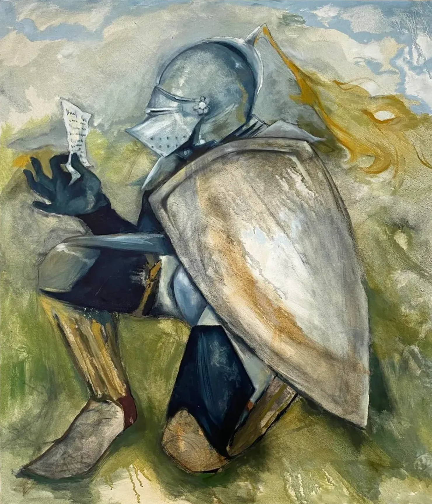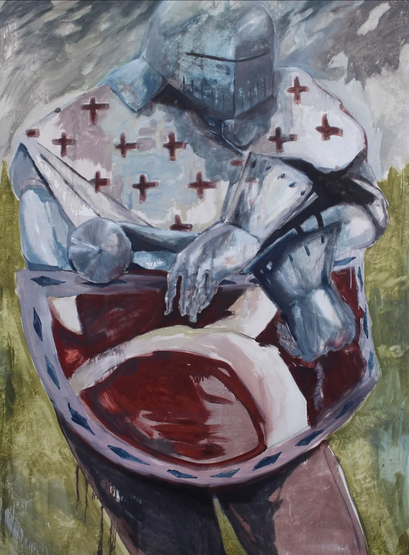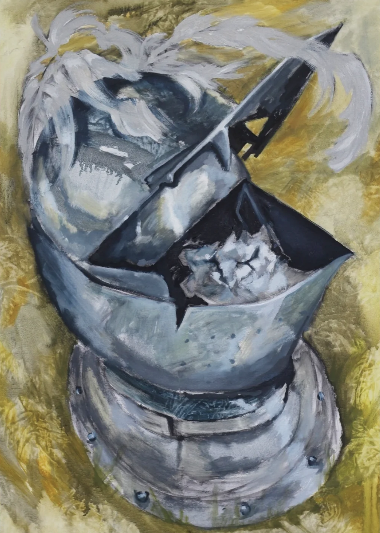 Vystavené obrazy jsou z velké části zaměřené na dekonstrukci ideálu rytířství, který je v současnosti často romantizován, reinterpretován a přetvářen popkulturou, jako už prapůvodní rytířské romány, časem pokroucené a kolikrát abstraktní pojmy rytířských cností, fantasy příběhy obecně, LARP (live-action roleplay) či amatérské historické inscenace. Jistým způsobem se vypořádávám taky s vlastní fascinací rytíři, která pramení z mého dětství a návaznosti na rodinná očekávání. Univerzálním prvkem pro vyprávění se mi stal motiv polo-rozpadlého, častokrát prázdného brnění. Snažím se ty prvky rytířské symboliky protínat více či méně s moderními či popkulturními, prostě snaha o dialog mezi minulostí a současností, tak, jak to kolikrát dělá právě LARP. Je to můj osobní pohled na téma rytířství, které by mohlo být nějakým univerzálním příběhem o hledání vlastní identity.
